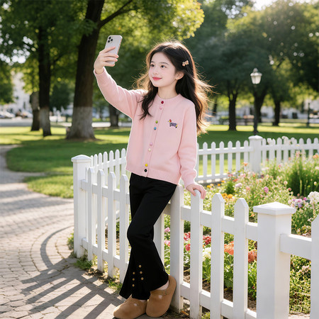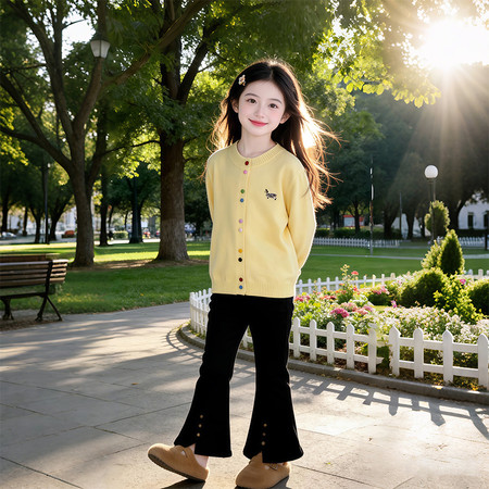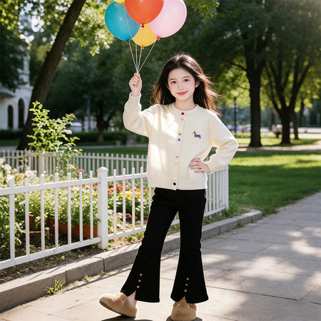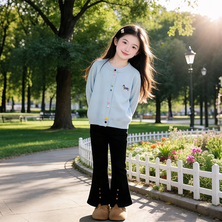 1*9收藏“25143-2腊肠狗彩扣开衫黑色喇叭裤”