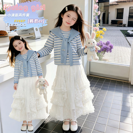蓝*7下载“26045-1蓝白条纹针织衫白色蕾丝裙”图片包