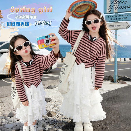 蓝*7下载“26045粉咖条纹针织衫白色蕾丝裙”图片包