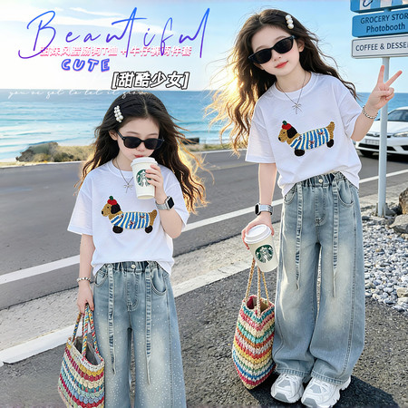 1*6收藏“26077白色KT短袖满天星系带牛仔裤”