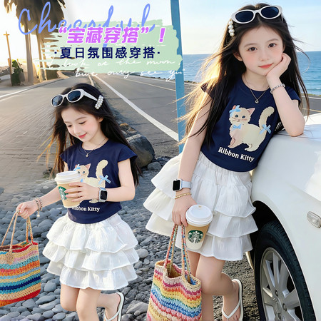 一*阳收藏“26083藏青猫咪T恤白色蛋糕短裙”