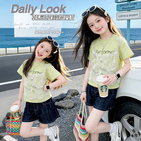 1*6收藏“26086柠檬绿蕾丝T恤牛仔阔腿短裤”