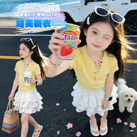1*6收藏“26089-1黄色彩扣冰丝短袖白色蛋糕裙”