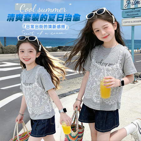 1*3收藏“26093灰色蕾丝T牛仔阔腿短裤”