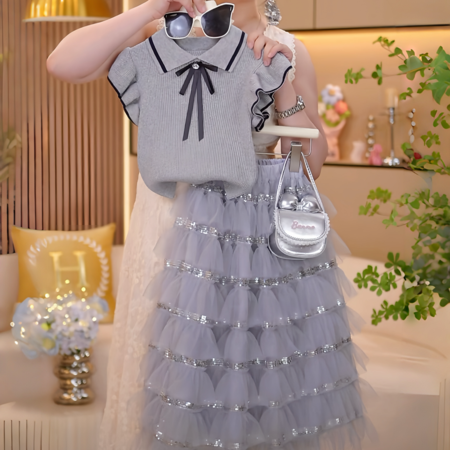 1*7下载视频“26099学院风冰丝飞飞袖亮片网纱半身裙”