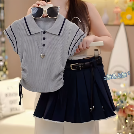 1*5收藏“26110-1灰色波浪袖冰丝短袖藏青百褶”