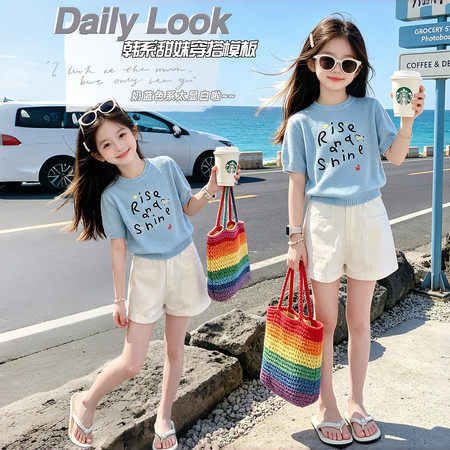 1*5下载“26121-1蓝色字母印花冰丝短袖白短裤”图片包